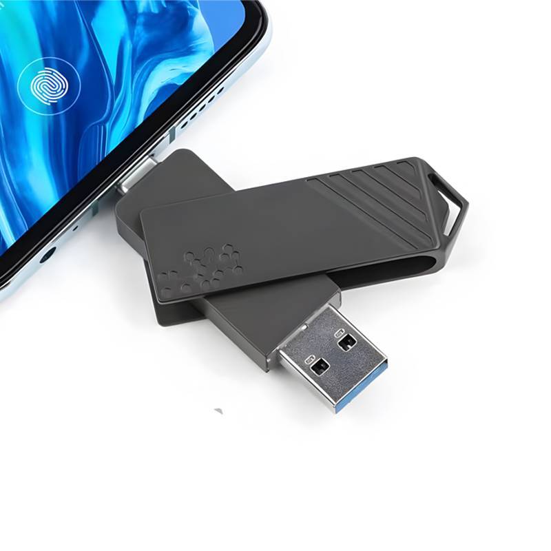 La clé USB rotative en métal pour téléphones combine un corps anti-chute en alliage de zinc, un transfert USB 3.0 à grande vitesse et une conception à double interface. Avec des services de bout en bout depuis l'usine source, allant de la personnalisation de la capacité à la gravure du logo, c'est un choix idéal pour le stockage de données d'entreprise et la vente en gros de cadeaux de marque.